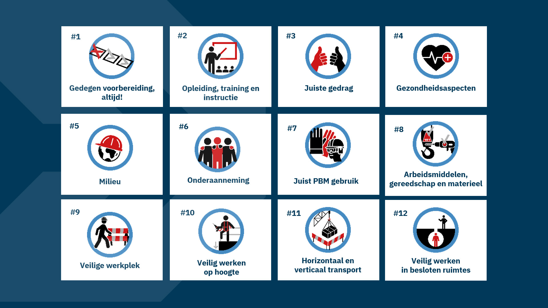 Veilig werken bij MedicomZes is een gedeelde verantwoordelijkheid. . Of je nu bij ons in dienst bent, als onderaannemer werkt of een andere rol vervult in één van onze projecten: zodra je de bouwplaats betreedt, gelden onze veiligheidsregels. Daarom hebben we 12 duidelijke regels opgesteld, elk voorzien van een herkenbaar pictogram en een korte uitleg. Ons doel: dat iedereen elke dag veilig naar huis gaat!